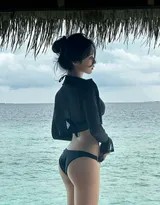 从艺术史的角度审视,这组作品隐约呼应着文艺复兴时期对理想人体美的追求,同时又带有现代极简主义的审美趣味。黑色泳装如同第二层皮肤,将身体的曲线转化为连绵的山脉与峡谷。腰臀之间的黄金比例在简约裁剪的衬托下尤为突出,而背部那道优雅的脊柱沟,则在海景的衬托下成为整幅画面的视觉引导线。