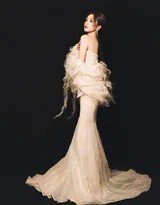 这组写真所呈现的,是一种内敛的高贵与克制的华美。它没有依靠视觉的冲击,而是凭借极致的和谐与细节的质感打动人心。哑光的缎面材质避开了张扬的光泽,反倒有种刚晒过太阳的白茉莉般的柔润感,灯光落下,晕开一层淡淡光晕。点缀的珠宝也绝非喧宾夺主,它们如夜空中的温柔星辰,零星却璀璨地闪烁在颈间与耳畔,共同强化了那种不染尘埃的纯净感。
