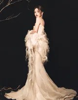 礼服的造型本身,便是美的核心。极致的立体剪裁精准贴合着她婀娜的身姿,大方展露出优越的肩颈线与精致的锁骨。那片区域的肌肤白皙胜雪,与礼服的暖白色调相互映衬,更显晶莹剔透,完美印证了“牛奶皮肤白梦妍”的美誉。裙身摒弃了繁复的装饰,仅凭流畅的线条与精妙的结构,便勾勒出女性身体的曲线之美。而最动人的莫过于那层层铺开的裙摆,它如同被晨风拂过的海浪,漾开柔和的波纹,随着步伐摇曳生姿,营造出步履生花的极致浪漫。