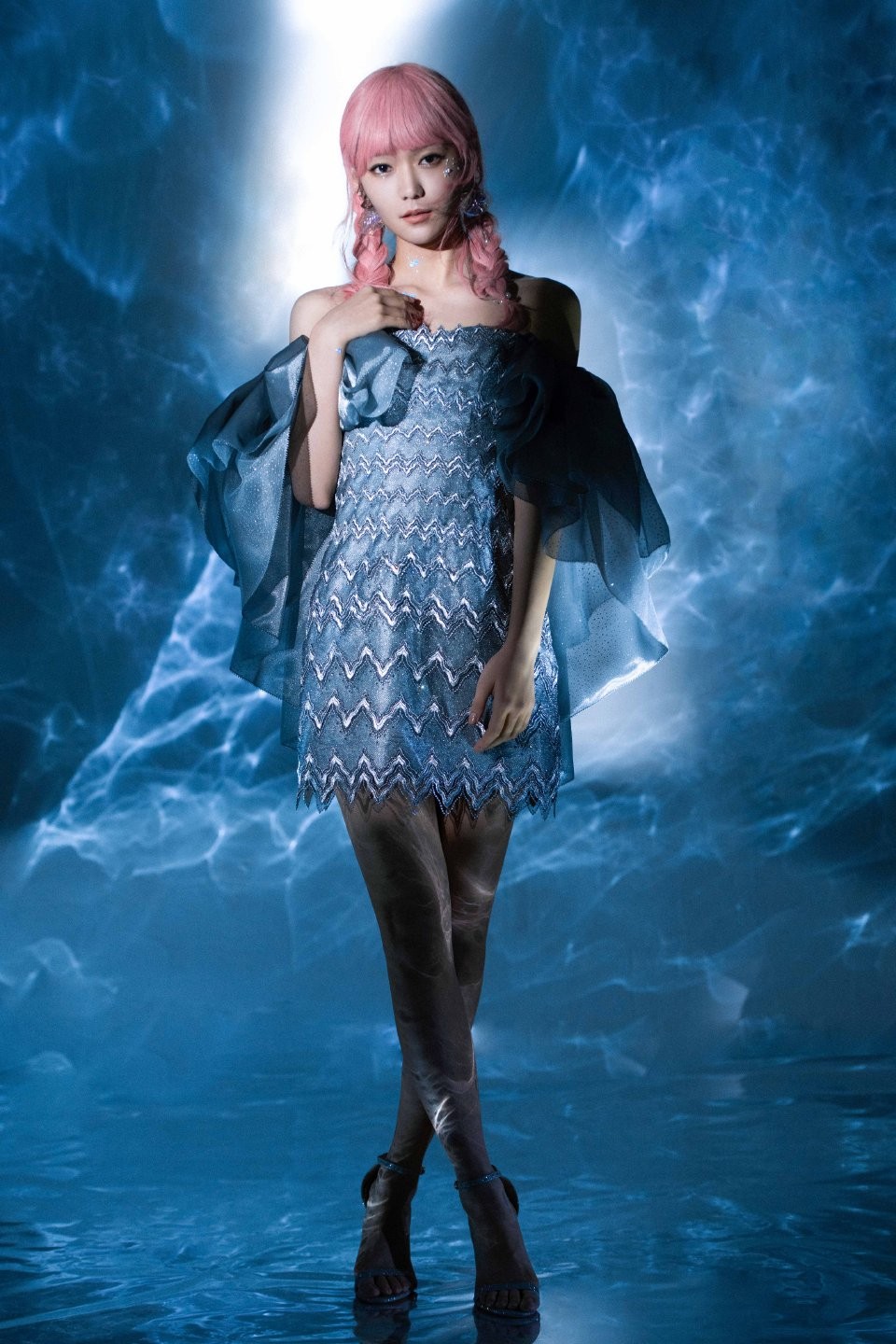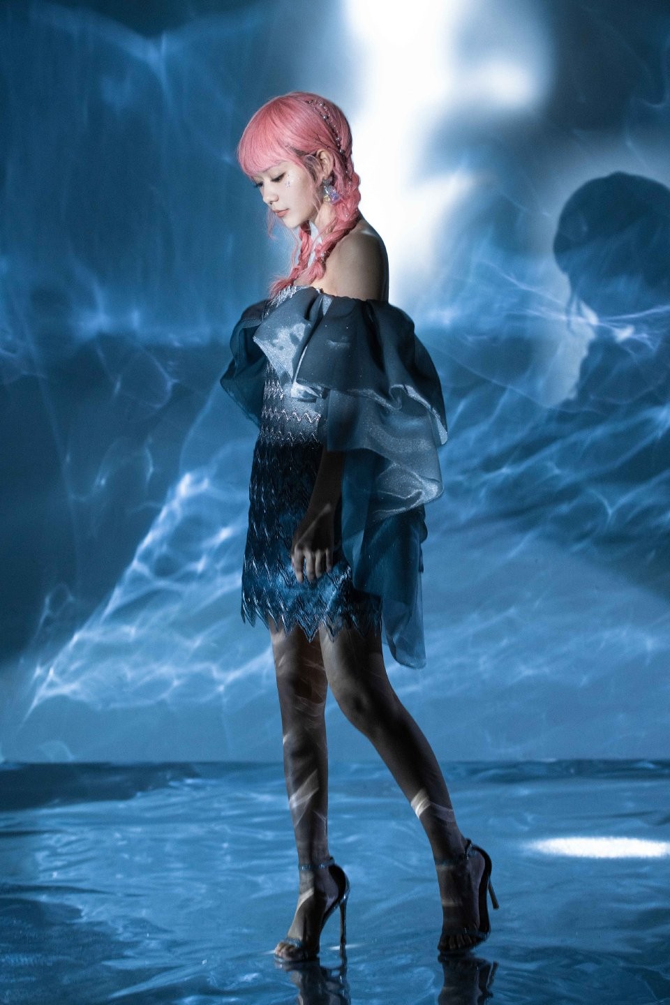 在这组最新的蓝色抹胸裙写真中,我们能看到她蜕变后的完美成果。这条礼服的剪裁极为考究,抹胸设计自信地展现出她漂亮的肩颈线条与精致的锁骨。前短后长的裙摆别具匠心,既活泼地凸显了她笔直修长的腿部优势,又通过后摆的延伸保留了礼服的隆重与优雅感。冰蓝色调的选择更是妙笔,它不同于深蓝色的沉静,也区别于天蓝色的稚嫩,而是一种兼具清爽与高贵感的色彩,与她白皙的肌肤相映衬,仿佛夏日里的一汪清泉,带来视觉上的清凉享受。