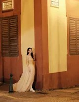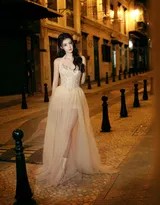 写真中,王楚然身着一袭设计精巧的轻纱长裙。裙身以朦胧的雾霾蓝或淡雅香槟色为主调,薄纱层层叠叠,营造出云雾缭绕般的飘逸感。面料在夜晚的人造光源下,时而折射出珍珠般的柔润光泽,时而又透出星辰似的细微闪亮,与夜幕下的城市霓虹交相辉映。这种材质的选用,使得她无论静立或微动,周身都仿佛环绕着一层柔和的光晕,仙气十足。